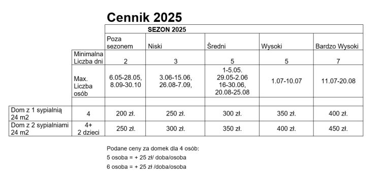 Tiny House -Chata Pirata - Cennik Dodatkowe opłaty: Parking na ośrodku - 20zł/doba/auto Opłata klimatyczna 2,5zł/os./doba Opłata za psa – 40 zł/doba/ pies Opłata za prąd ryczałt - 20zł / doba/ dom , dotyczy terminów : kwiecień, maj, wrzesień, październik Sprzątanie końcowe - 100zł ( dla pobytów poniżej 5 nocy w miesiącach lipiec i sierpień oraz w okresach świątecznych) komplet ręczników 2x- 20zł/ osoba Kaucja zwrotna 300 zł - na wypadek ewentualnych szkód- zwracana w dniu wymeldowania po sprawdzeniu stanu domku Pobierz cennik Masz pytanie? Skontaktuj się z nami! Kontakt
